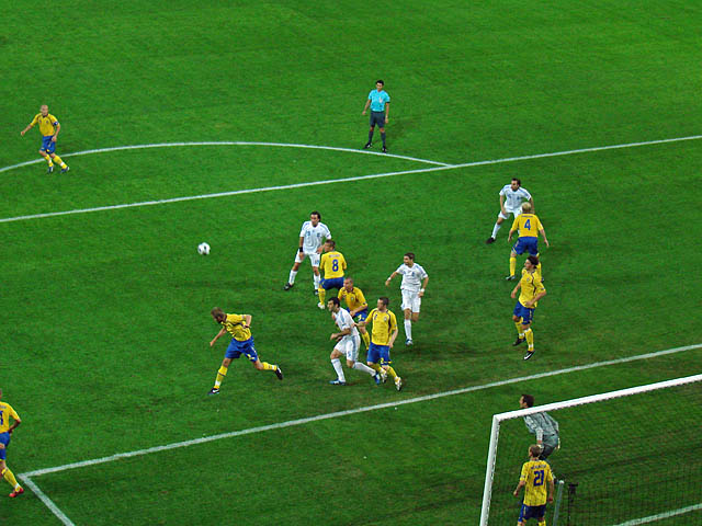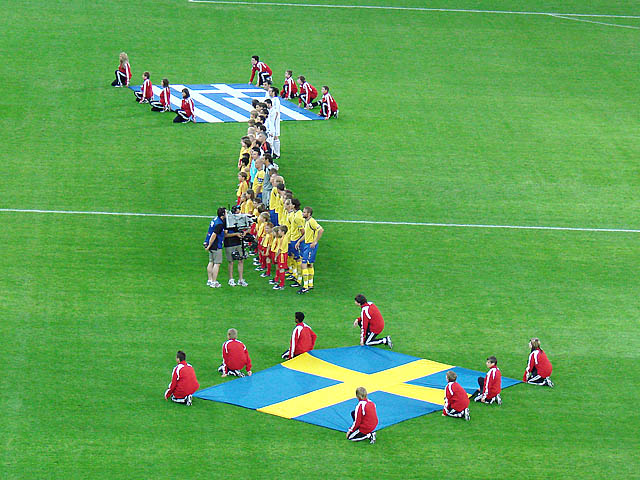 Spielerisch war die 1. Halbzeit wahrlich kein Leckerbissen, da die Griechen mit ca. 8 Defensivakteuren das Spiel mehr oder weniger zerstörten. Der Unmut über diese „Leistung“ wurde in lautstarken Pfeifkonzerten kund getan. Wir konnten nur auf eine bessere zweite Hälfte mit Toren (für Schweden) hoffen. Unser Höhepunkt war aber Dan, der sich beim Versuch nach der Plörre unter dem Stuhl zu greifen, den Schädel lediglich „leicht“ am Geländer aufsetzte.