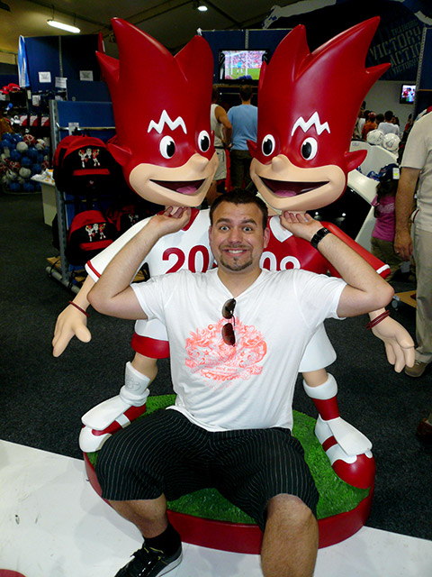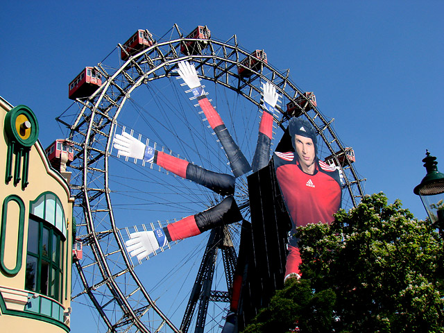 Von da aus begaben wir uns wieder in die Stadt, wo gegen Mittag schon Halligalli angesagt war. Hunderte Italiener und Spanier zogen durch die Innenstadt und waren noch bestens gelaunt. Nach einer kleinen Shopping-Tour, einige Geschäfte hatten auch Sonntags auf, fuhren nach kurzem Zwischenstopp im Hotel auf den Prater, der relativ nah am Stadion gelegen ist. Auch hier war eine kleine Fanmeile und viele Fußballfans. Also schlenderten wir noch gemächlich über den Prater, trafen den Watschn-Mann, machten Geschwindigkeits-Schüße (Sieger war ich mit 103 km/h 🙂 ) und stärkten uns im Biergarten.