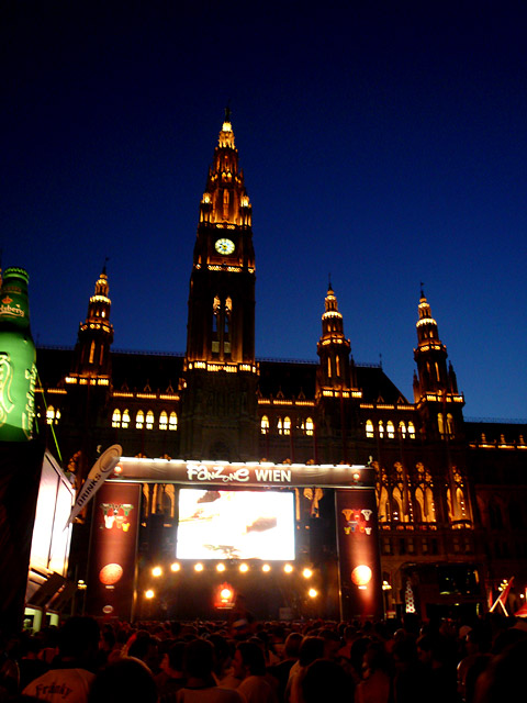 Zur Abkühlung begaben wir uns dann zum größten Kaffeehaus der Welt. Julius Meinl klotzte zur EM eine riesige (3.000 qm) Stahlkonstruktion mit dem Namen Kaffeewelt neben die Wiener Fanmeile. Ihr könnt Euch vorstellen, dass die Preise dementsprechend „gehoben“ waren. Anschließend schauten wir uns die riesige zweiteilige Fanmeile mit Unterhaltungsmöglichkeiten an, die gegen Nachmittag aber noch sehr verlassen war. Trotzdem nahmen wir uns vor das Viertelfinale am Abend hier zu schauen.