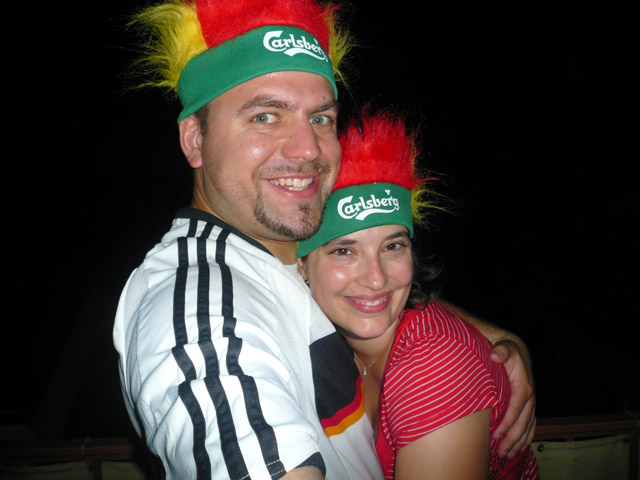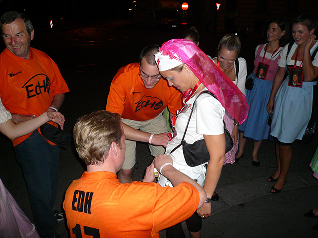 Nach über 180 min Stehen (das Spiel musste ja in die Verlängerung gehen) waren nicht nur die Holländer, sondern auch wir fertig. Wir hatten ordentlich „Rücken“. Alles in Allem war die Stimmung gut, jedoch nicht mit 2006 zu vergleichen. Müde und verschwitzt fuhren wir zurück ins Hotel, lediglich unterbrochen von einem Junggesellinnen-Abschied (siehe Bilder). 😉