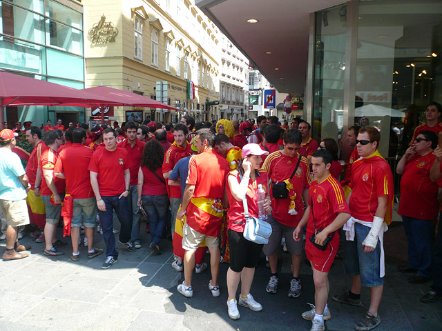 Das Spiel selber hat wohl jeder gesehen, sprich wir bekamen ein maues Spiel beider Mannschaften, aber mit Elfmeterschießen. Zum Glück gewannen die bemühteren Spanier. Die Stimmung im Stadion war sehr gut und wir hatten Super-Plätze. Im Gegensatz zu Salzburg verlief die Heimfahrt auch nahezu perfekt. So schnell sind wir noch nie aus einem vollbesetzten Stadion per U-Bahn Nachhause gekommen. Respekt, Wien!