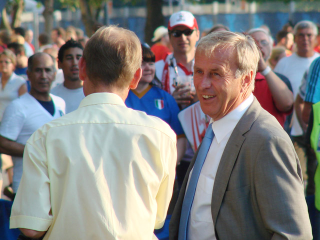 Im Hotel frischgemacht und umgezogen (alle in orangen EdH-Trikots) fuhren wir gegen Abend dann zum Rathaus, wo die große Fanmeilen-Bühne aufgebaut war. Natürlich waren wir in unseren Shirts die Hingucker. Man wurde immer erst mal als Holländer vermutet und angesprochen, was im übrigen eine sehr gute Tarnung war (als Deutscher war man mal wieder nicht so beliebt). Die Fanmeile war nun schon sehr voll und es drängten sich Fans verschiedener Nationen (oder zumindest in verschiedenen Trikots). Nach einer kurzen Stärkung mit UEFA-lizensierten Fressalien ging auch schon das Spiel NED vs. RUS los.