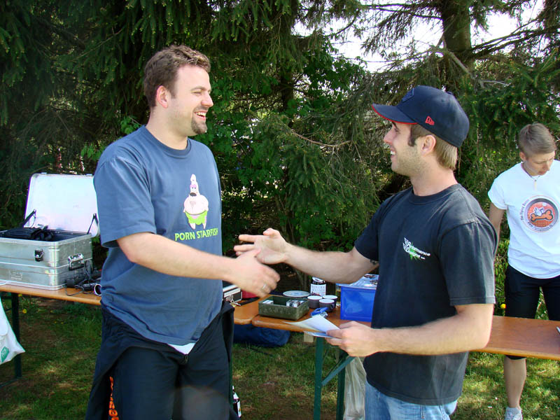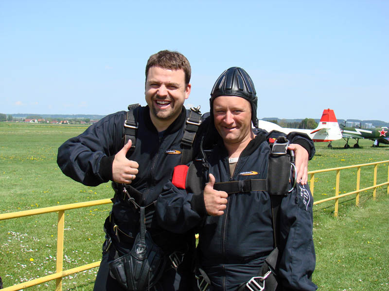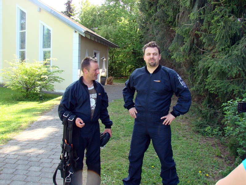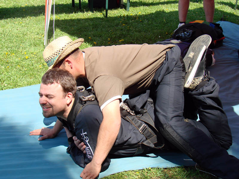 Dann war Trockenübung angesagt, sprich man übte mit dem Tandem-Master die Flug- und Landehaltung. Wie lustig das in der Theorie war, kann man an den dabei entstandenen Fotos sehen. Mein Tandem-Master war der etwas kleinere aber supernette Stefan Schröder, der den ganzen Sprung zusätzlich mit einer Handkamera auf Video festhielt. Und dann war es auch schon so weit.
