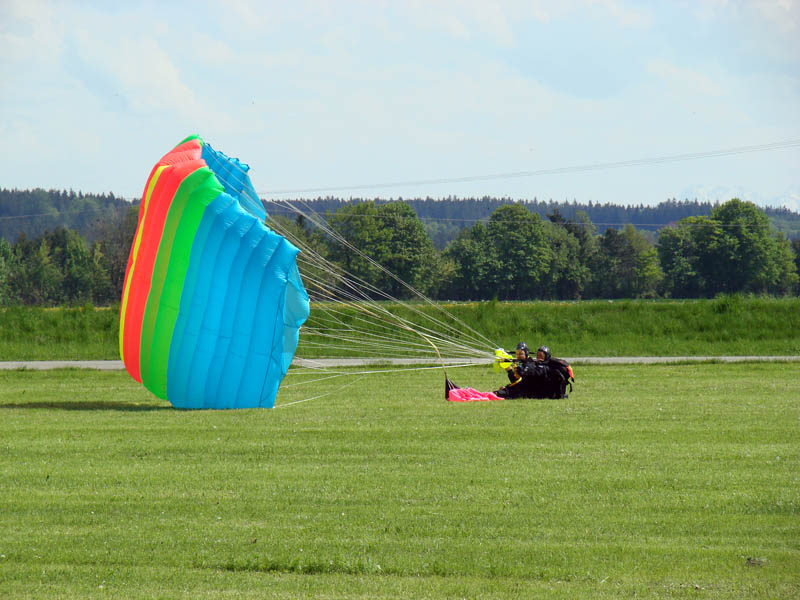 Tandem Master-Stefan ließ mich für ein paar Minuten sogar den Schirm steuern, was sehr viel Spaß machte. Wenig später nahm er die Steuerseile zurück, denn wir begannen mit dem Landeanflug auf das Feld neben dem Flugplatz. Davor hatte ich ein wenig Bedenken, da man die Beine schön hoch nehmen muss um gemeinsam auf dem Popo landen zu können. Der Grund dafür war, dass der Gurt an dem Oberschenkeln enorm drückte und ich wenig Gefühl in den Beinen hatte. War aber alles halb so schlimm, denn wir legten beide eine professionelle Arschlandung hin (siehe Video unten).