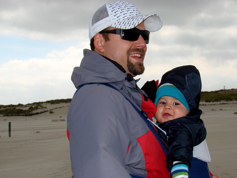 Auf dem Weg dorthin machten wir zum ersten Mal Bekanntschaft mit dem starken Wind und den Sandverwehungen. Auch blieben wir kurz vor dem Strand mit dem Kinderwagen im Sand stecken. Aufhalten ließen wir uns dadurch nicht, Jonas ab ins Baby-Björn und runter zu den Nackten. Die waren aber bei diesen Witterungsverhältnissen in einer äußerst spärlichen Minderheit, so dass wir schnell ein paar Fotos (natürlich von uns und angezogen) machen konnten. Aufgrund mangelnder Gemütlichkeit machten wir uns auch wieder zügig auf den Rückweg. Den Weg wieder Richtung Fähre haben wir dann komplett am Strand entlang zurückgelegt, was leider ein großer Fehler war. Nicht einmal nach der Jeep-Safari in Fuerteventura hatten wir so viel Sand in den Klamotten und im Kinderwagen. Den hatte ich dann im Hotel bis auf die Einzelteile zerlegt um jeglichen Sand zu entfernen.