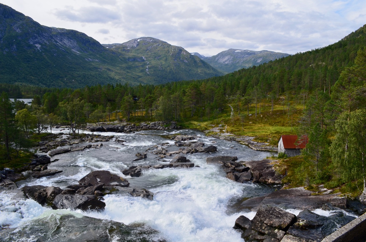Mit Ålesund hatten wir ja unseren nördlichsten Punkt erreicht, demnach ging es für uns wieder Richtung Süden, genauer gesagt nach Bergen. Da wir aber allzu lange Autofahrten vermeiden wollten, hatten wir noch zwei Zwischenstopps auf dem Weg nach Bergen eingeplant. Um mal etwas mehr den Outdoor-Charakter zu betonen und nicht nur in Hotels zu nächtigen, buchten wir als Halt Nummer 1 eine kleine Hütte in Vassenden. Bei Jølstraholmen Camping & Cottages konnten wir eine nette und geräumige Hütte beziehen, die auch noch direkt an einem Fluß lag. Sogar Brennholz für den Kamin wurde uns zur Verfügung gestellt, was uns einen sehr gemütlichen Abend bescherte. Am Abend kamen wir sogar mit unseren Nachbarn ins Gespräch, die uns einen kleinen Obstkorb überreichten. Die nette 5-köpfige Familie stammte aus Abu-Dhabi und machte ebenfalls eine Erkundungsreise durch Norwegen.