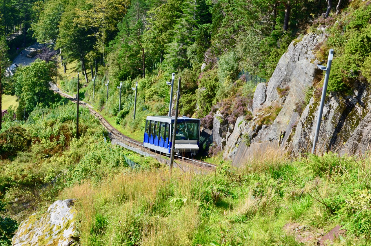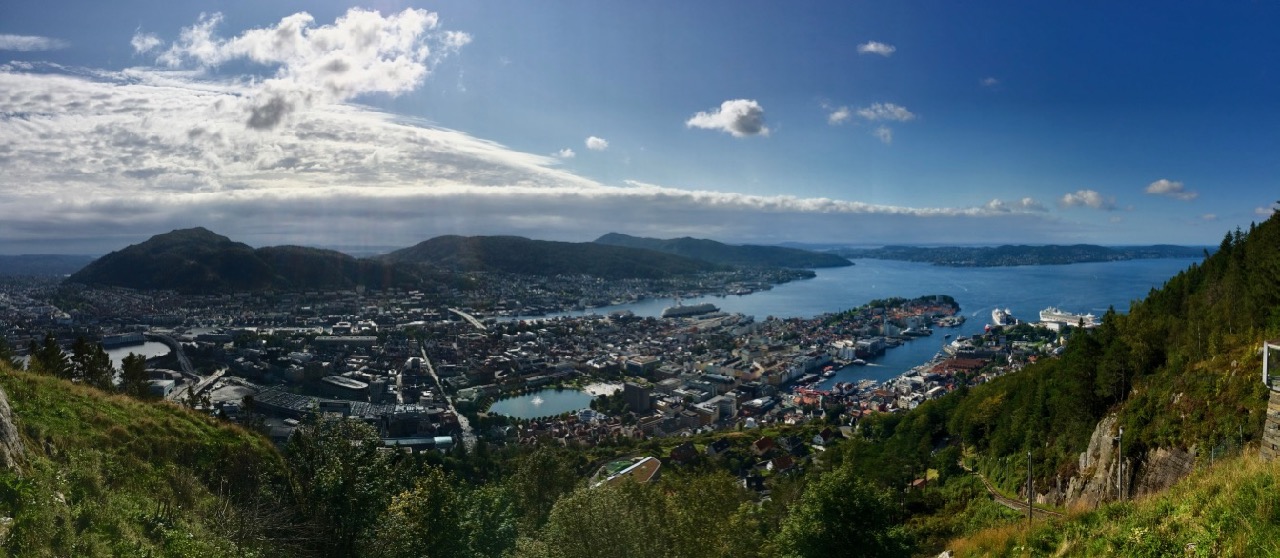 Dem Pre-Teenie-Hormonstau fliehend, wanderten wir ein paar hundert Meter weiter zum Fischerei-Museum, wo uns ein freundlicher Einheimischer (Johannes) gleich auf Deutsch begrüßte, als er die Kreditkarte sah. Hier war so gut wie nichts los und wir konnten unser Fachwissen – als Stadtmenschen ohne Hafen – auf drei Stockwerken enorm erweitern. Von der Historie des norwegischen Fischfangs, bis zu wichtigen Umweltaspekten, war alles anschaulich und multimedial aufbereitet. Zum Abschluss erhielt Jonas sogar noch ein T-Shirt und ein Gummitierchen, da er alle Kinderrätsel lösen konnte. Nach soviel Fisch zog es uns Bayern wieder Richtung Berg und wir nahmen die Fløibahn – eine Art Zahnradbahn – um bei schönstem Wetter schnellstmöglich auf den Gipfel des Fløyenmit zu gelangen. Zum Glück waren zu dieser Zeit die Passagiere der VIER (!) ankernden Kreuzfahrtschiffe bereits wieder unterwegs Richtung Schiff, somit hielt sich die Wartezeit in überschaubaren Grenzen. Von oben genossen wir dann den wunderschönen Panoramablick auf die Stadt Bergen. Neben dem schönen Ausblick, konnten wir auf dem Berg sogar noch einen netten kleinen Spaziergang machen.