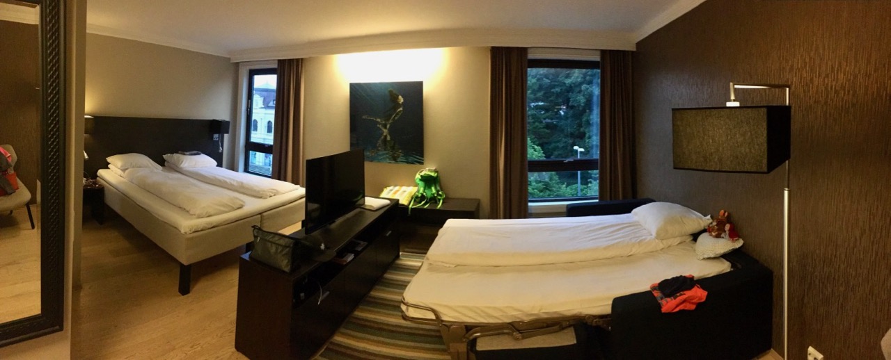 Nach den zwei sehr unterschiedlichen Zwischenstopps und der Kuhpolizei, erreichten wir mit Bergen endlich die zweitgrößte Stadt Norwegens. Das Hotel (Magic Hotel) hatte diesmal Bettina ausgewählt und es überraschte uns mit einem stylischen Look, der wie eine Requisite aus dem Sci-Fi-Film Tron wirkte. Für Jonas gab es am Empfang sogar einen kleinen Zauberkasten. Mit Bergen endete auch unsere „Eine-Nacht-und-weiter“ Strategie, da wir in den größeren Städten nun immer 2 Nächte eingeplant hatten. Um nicht mit dem Auto durch die Innenstadt fahren zu müssen, besorgten wir uns eine Bergen Card, mit der wir den öffentlichen Nahverkehr nutzen konnten und auch Ermäßigungen in Museen oder Restaurants erhielten.